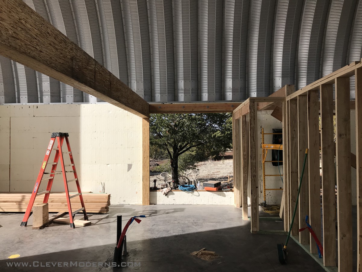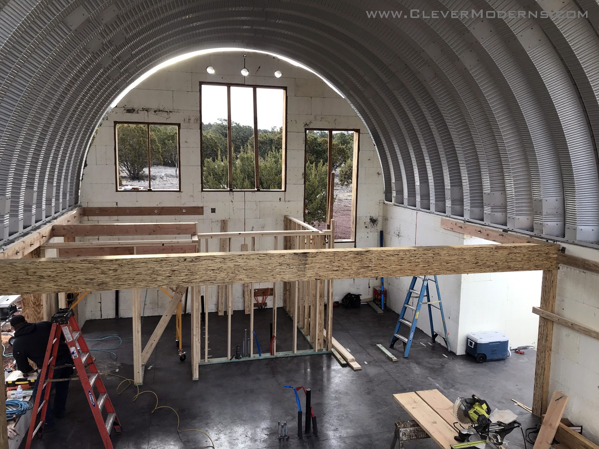 The Loft House is no longer a big empty shell! Our framing crew has been on the scene, and really transformed things. Here’s how it looked before they started. Bare bones ICF walls with the Quonset roof overhead.